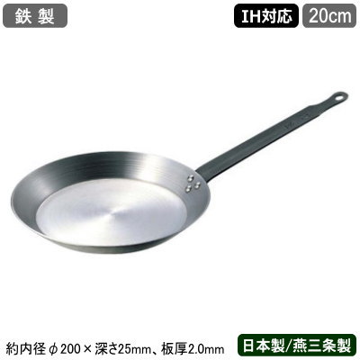 他のクレープパンシリーズはこちら! 他のIH対応フライパンはこちら! 【商品仕様】 ●サイズ/約内径φ200×深さ25mm、板厚2.0mm ●材質/鉄製 ●IH電磁調理器対応 ●日本製(新潟県燕三条) ※メーカーに在庫がある場合は3営業日以内に発送させて いただきますが、稀に在庫がない場合もございますので、 お急ぎの場合はお問い合わせください。